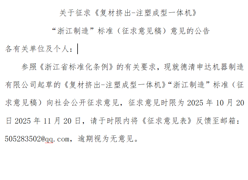 各有關(guān)單位及個人:參照《浙江省標(biāo)準(zhǔn)化條例》的有關(guān)要求,現(xiàn)就德清申達機器制造有限公司起草的《復(fù)材擠出-注塑成型一體機》“浙江制造”標(biāo)準(zhǔn)(征求意見稿)向社會公開征求意見,征求意見時限為2025年10月20日2025年11月20日,請于時限內(nèi)將《征求意見表》反饋至郵箱:505283502@qq.com,逾期視為無意見。附件:關(guān)于征求.docx團體標(biāo)準(zhǔn)?71.docx征求意見表.docx編制說明.doc